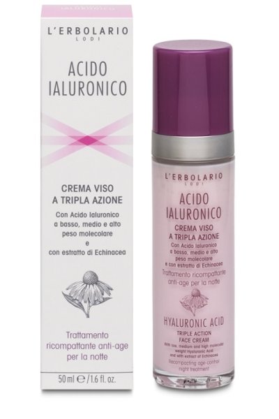 Trattamento ricompattante anti-age notturno con acido ialuronico a tre pesi molecolari.