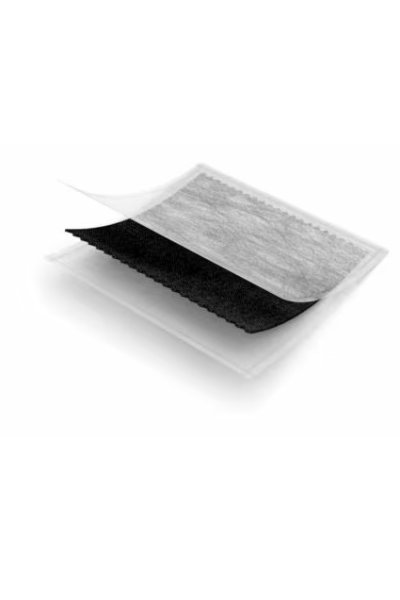 Medicazione con carbone attivo con argento, racchiusa in una ghiera di nylon non aderente, che non solo maschera l'odore ma, grazie al carbone attivo, lega i batteri e le tossine batteriche nella medicazione.