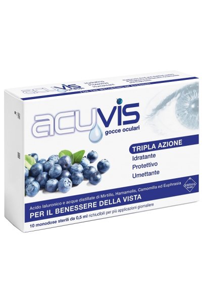 Acuvis gocce oculari è un Dispositivo Medico ad uso oftalmico costituito da una soluzione isotonica, sterile, a pH fisiologico, privo di conservanti, a base di acido ialuronico, glicerina e acque distillate ed è contenuto in strip da 5 fiale monodose riempiti a 0,5 mL.La combinazione di acido ialuronico e glicerina conferisce alla gocciaoculare un’azione protettiva, idratante ed umettante che stabilizza e reintegra il film lacrimale e minimizza gli attriti durante l’ammiccamento.