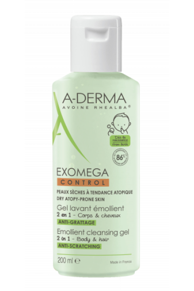 EXOMEGA CONTROL Gel Detergente Emolliente 2 in 1 Corpo e Capelli, lava, lenisce e protegge la pelle secca a tendenza atopica di neonati e bambini. Formula 2 in 1 per rendere morbida la pelle dei bambini. Schiuma vellutata, consistenza "non scivolosa", che si sciacqua facilmente. Senza sapone, pH fisiologico. Non brucia gli occhi. Formula biodegradabile per il rispetto dell'ambiente. Testato sotto controllo oftalmologico, dermatologico e pediatrico.