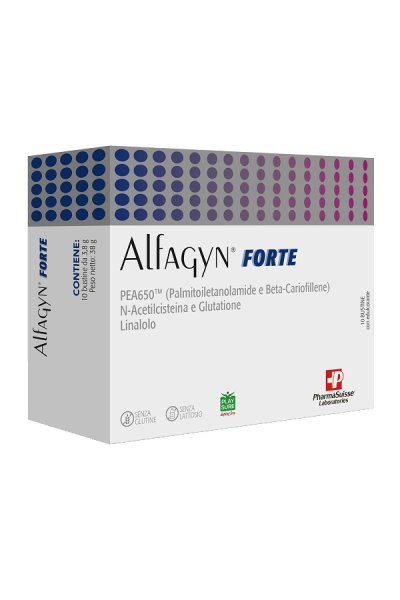 Alfagyn forte è un integratore alimentare a base di PEA650, associazione di Palmitoiletanolamide (PEA) e Beta-Cariofillene (da estratto di pepe nero), N-acetilcisteina, glutatione, vitamina C e linalolo (da estratto di coriandolo), utile in caso di ridotto apporto con la dieta o aumentato fabbisogno di tali nutrienti. Il coriandolo ha azione antiossidante. La vitamina C contribuisce al normale funzionamento del sistema nervoso, alla riduzione della stanchezza e dell’affaticamento e al normale metabolismo energetico.