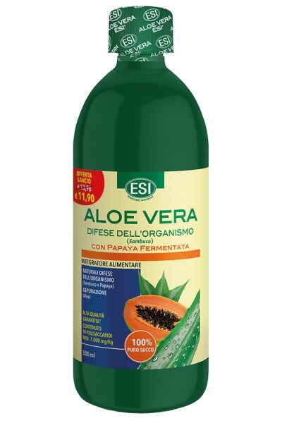 Integratore alimentare a base di aloe vera foglie decorticate (gel senza cuticola). Il gel contenuto all'interno delle foglie di aloe vera favorisce le funzioni depurative dell'organismo ed ha azione emolliente e lenitiva sul sistema digerente. Con papaya frutto (fermentato) ed estratto titolato di sambuco. La papaya favorisce le naturali difese dell'organismo ed ha anche proprietà antiossidanti e digestive. Il sambuco è utile per favorire le naturali difese dell'organismo e aiuta la funzionalità delle prime vie respiratorie.