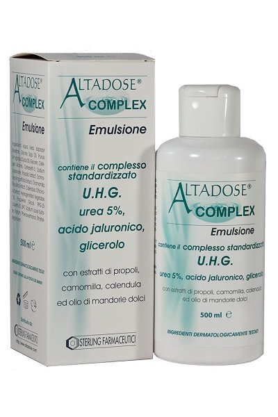 Dermaceutico contenente il complesso standardizzato U.H.G. (urea 10%, acido jaluronico, glicerolo) ad alto potere idratante ed emolliente. Contiene estratti di echinacea, camomilla, calendula ed olio di mandorle dolci, sostanze riconosciute a livello scientifico per le loro proprietà antibatteriche, antiflogistiche ed antiprurito. L'emulsione Altadose Complex è indicata come coadiuvante alle terapie in casi di dermatite atopica e di xerosi cutanea.