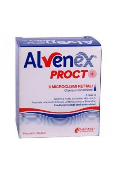 Alvenex Procto è un dispositivo medico a base di Glicerina, Acido ialuronico, Vitamina E, Aloe vera ed estratti di Rusco, Centella asiatica e Boswellia. E' un dispositivo medico con attività filmogena, protettiva e lubrificante, coadiuvante negli stati emorroidari e nei processi di normalizzazione della mucosa anale.