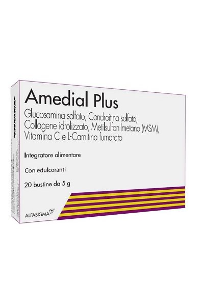Integratore alimentare utile in tutti i casi di ridotto apporto con la dieta o di aumentato fabbisogno di Glucosamina solfato, Condroitina solfato, Collagene idrolizzato, Metilsulfonilmetano (MSM), Vitamina C e L-Carnitina fumarato. La Vitamina C contenuta in AMEDIALâ„¢ Plus, aiuta la regolare formazione del collagene per mantenere in buono stato le ossa, contribuendo inoltre alla formazione del collagene per il buon funzionamento delle cartilagini.Ingredienti