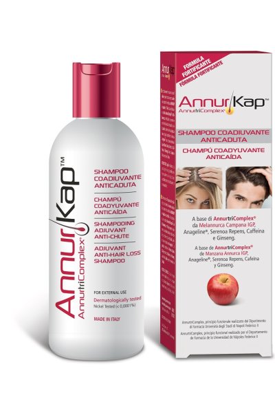 Specificatamente formulato per capelli deboli e con tendenza a cadere, coadiuva i trattamenti anticaduta AnnurKap in capsule e in fiale. A base dell’esclusivo estratto AnnurtriComplex da Melannurca, contribuisce a prevenire e contrastare la caduta dei capelli, rivitalizzandoli e donando alla capigliatura tono e vigore. Completano la formula Anageline®, un prezioso estratto del Lupino Bianco Dolce, l’estratto di Caffeina, di Ginseng, l’olio di Jojoba e l’olio essenziale di Timo. Adatto anche per un uso quotidiano.