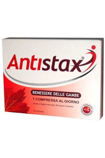 Antistax compresse è un integratore alimentare a base di estratto standardizzato di foglie di vite rossa AS 195 che, con le sue proprietà naturali, aiuta a mantenere il benessere delle gambe. I flavonoidi, infatti, contenuti nell’estratto di foglie di vite rossa, offrono un aiuto per migliorare il trofismo del microcircolo (stato di nutrizione e ossigenazione dei tessuti).