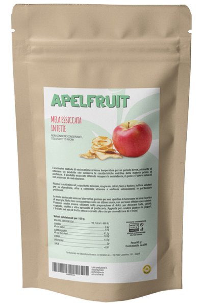 Mela essiccata in fette. L'esclusivo metodo di essiccazione a basse temperature per un periodo breve permette di ottenere un prodotto che conserva le caratteristiche nutritive della materia prima di partenza.