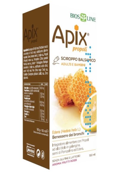 Integratore alimentare con propoli ad alto titolo in galangina, semi di pompelmo ed edera. Apix Propoli Sciroppo balsamico associa le ben note proprietà della propoli, ad alto titolo in galangina, a quelle antiossidanti dei semi di pompelmo, ricchi in bioflavonoidi. Contiene inoltre, estratti di edera e piantaggine, oli essenziali di eucalipto e pino mugo e zinco. L'edera, titolata in ederacoside C, fluidifica le secrezioni bronchiali, la piantaggine titolata in verbascoside, svolge un'azione emolliente e lenitiva sulle mucose delle vie respiratorie, mentre gli oli essenziali di eucalipto e pino mugo svolgono un'azione balsamica. Infine, lo zinco favorisce le naturali difese dell'organismo.