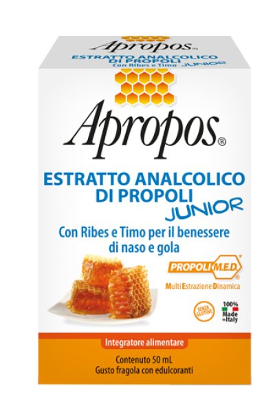 Integratore alimentare a base di propoli, ribes nigrum e timo, dal gradevole sapore alla fragola. La presenza del timo rende il prodotto particolarmente indicato per il benessere di naso e gola.La linea Apropos è caratterizzata dalla presenza degli estratti di propoli ottenuti con una metodologia estrattiva innovativa: la multi estrazione dinamica (M.E.D.). Quindi la propoli Apropos massimizza, rispetto alle estrazioni tradizionali, la presenza di Flavonoidi e di Polifenoli, come acidi fenolici, bioflavonoidi agliconi e glucosidi.