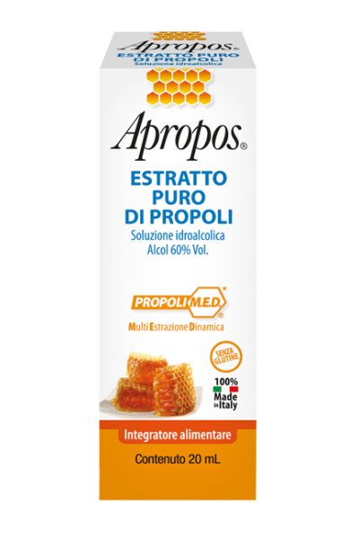 Integratore alimentare a base di Propoli purificata e concentrata.Gli estratti di propoli sono ottenuti con una metodologia estrattiva innovativa: la Multi Estrazione Dinamica (M.E.D.). Quindi la propoli Apropos massimizza, rispetto alle estrazioni tradizionali, la presenza di Flavonoidi e di Polifenoli, come acidi fenolici, bioflavonoidi agliconi e glucosidi.
