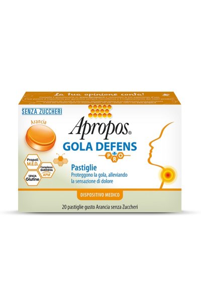 Apropos Gola Defens PRO Pastiglie, grazie al Complesso Barriera APM composto da “Attivi Polimerici Mucoadesivi”, crea un film mucoadesivo ad effetto barriera che protegge la mucosa orofaringea dall’attacco di agenti esterni dannosi, idratandola e svolgendo un’azione lenitiva. Grazie all’azione filmogena ed alla presenza di Propoli M.E.D., Apropos Gola Defens Pastiglie mantiene la gola protetta dagli agenti esterni, alleviando la sensazione di dolore legata agli stati irritativi della gola, tipici delle faringiti e delle tonsilliti.
