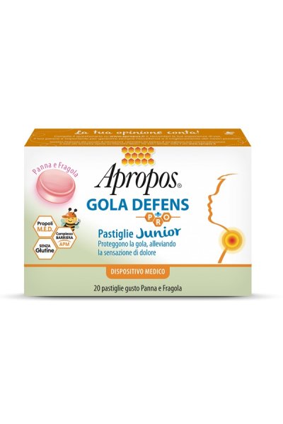 Apropos Gola Defens PRO Pastiglie, grazie al Complesso Barriera APM composto da “Attivi Polimerici Mucoadesivi”, crea un film mucoadesivo ad effetto barriera che protegge la mucosa orofaringea dall’attacco di agenti esterni dannosi, idratandola e svolgendo un’azione lenitiva. Grazie all’azione filmogena ed alla presenza di Propoli M.E.D., Apropos Gola Defens Pastiglie mantiene la gola protetta dagli agenti esterni, alleviando la sensazione di dolore legata agli stati irritativi della gola, tipici delle faringiti e delle tonsilliti.