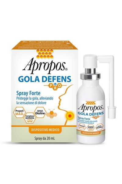 Apropos Gola Defens PRO, grazie al Complesso Barriera APM composto da “Attivi Polimerici Mucoadesivi”, crea un film mucoadesivo ad effetto barriera che protegge la mucosa orofaringea dall’attacco di agenti esterni dannosi, idratandola e svolgendo un’azione lenitiva. Grazie all’azione filmogena ed alla presenza di Propoli M.E.D., Apropos Gola Defens mantiene la gola protetta dagli agenti esterni, alleviando la sensazione di dolore legata agli stati irritativi della gola, tipici delle faringiti e delle tonsilliti.