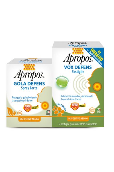 Apropos GOLA DEFENS Spray Forte, grazie al Complesso Barriera APM, composto da "Attivi Polimerici Mucoadesivi", crea un film mucoadesivo ad effetto barriera che protegge la mucosa orofaringea dall'attacco di agenti esterni dannosi, idratandola e svolgendo un'azione lenitiva. Grazie all'azione filmogena ed alla presenza di Propoli M.E.D.*, Apropos GOLA DEFENS Spray Forte mantiene la gola protetta dagli agenti esterni, alleviando la sensazione di dolore legata agli stati irritativi della gola, tipici delle faringiti e delle tonsilliti.
