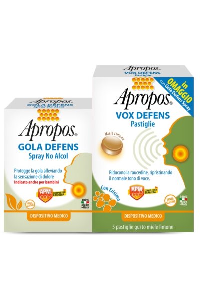 Apropos Vox Defens è un dispositivo medico appositamente formulato per contribuire alla riduzione della raucedine, in caso di alterazione o perdita del tono di voce.