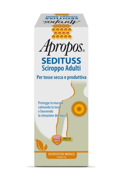 Grazie al Complesso Barriera Propoli HXG, crea un film protettivo mucoadesivo ad effetto barriera per il controllo del microambiente che, proteggendo e idratando la mucosa delle prime vie aeree, calma la tosse e rende il muco più fluido, agevolandone la rimozione. Inoltre, grazie all’effetto filmogeno, svolge un’azione coadiuvante nell’alleviare i disturbi tipici della tosse, sia secca che produttiva. Il miele e gli oli essenziali presenti nella formulazione, danno ad Apropos Sedituss Sciroppo Adulti un sapore gradevole e un piacevole effetto balsamico.