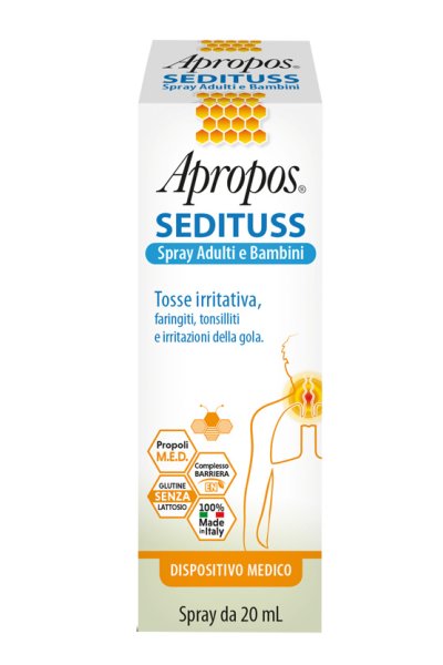 Apropos Sedituss Spray Adulti e Bambini calma i fastidi della mucosa orofaringea associati a tosse irritativa, faringiti e tonsilliti. Una gola irritata contribuisce a promuovere lo stimolo della tosse. Gli estratti naturali di dimostrata efficacia presenti nel Complesso Barriera EN e la Propoli M.E.D. formano un film protettivo che riduce il bruciore, il dolore e la sensibilità alla deglutizione. Svolge un’azione reidratante e lenitiva sulla mucosa orofaringea e limita il contatto con gli agenti esterni offensivi quali freddo, fumo, smog, polveri. Un delicato aroma di menta naturale unito alla dolcezza del miele presente nella formulazione, infine, conferisce ad Apropos Sedituss Spray Adulti e Bambini un gradevole e piacevole sapore.