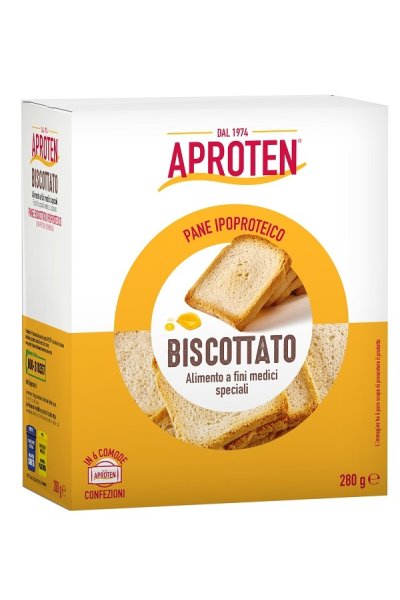 Il pane biscottato ipoproteico, della linea di prodotti APROTEN, è caratterizzato da: contenuto basso di proteine, sodio, fosforo e potassio che lo rendono indicato per la gestione dietetica di insufficienze renali (nefropatie); contenuto basso di tirosina e fenilalanina che lo rendono indicato per la gestione dietetica di aminoacidopatie metaboliche (fenilchetonuria, tirosinemia); contenuto basso di proteine che lo rendono indicato per la gestione dietetica del morbo di Parkinson (in terapia con Levodopa). Per il paziente in terapia con Levodopa deve essere valutato il grado di eventuale disfagia e le eventuali problematiche di malnutrizione per difetto che possono insorgere in condizioni di restrizione proteica.