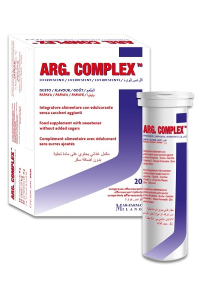 Integratore alimentare effervescente a base di arginina, taurina, carnitina, vitamina C, papaya fermentata, zinco e acido folico.