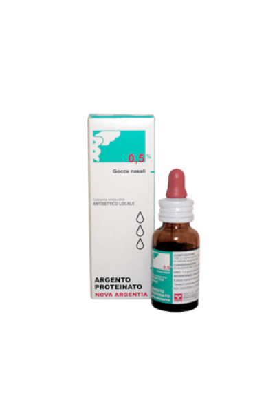 ARGENTO PROTEINATO NOVA ARGENTIA 0,5% gocce nasali e auricolari, soluzione 100 g di soluzione contengono: Principio attivo: argento proteinato g 0,50. ARGENTO PROTEINATO NOVA ARGENTIA 1% gocce nasali e auricolari, soluzione 100 g di soluzione contengono: Principio attivo: argento proteinato g 1,00. ARGENTO PROTEINATO NOVA ARGENTIA 2% gocce nasali e auricolari, soluzione 100 g di soluzione contengono: Principio attivo: argento proteinato g 2,00. Per l’elenco completo degli eccipienti vedere paragrafo 6.1.
