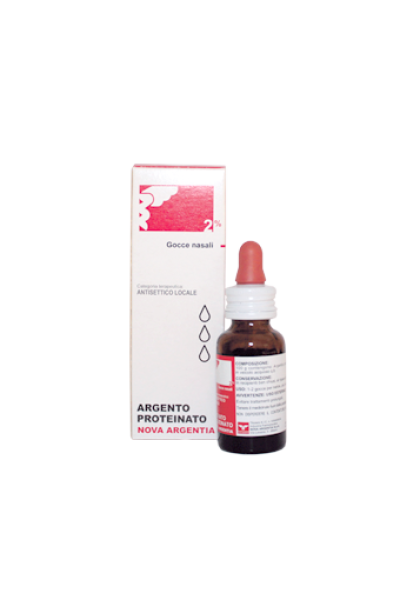 ARGENTO PROTEINATO NOVA ARGENTIA 0,5% gocce nasali e auricolari, soluzione 100 g di soluzione contengono: Principio attivo: argento proteinato g 0,50. ARGENTO PROTEINATO NOVA ARGENTIA 1% gocce nasali e auricolari, soluzione 100 g di soluzione contengono: Principio attivo: argento proteinato g 1,00. ARGENTO PROTEINATO NOVA ARGENTIA 2% gocce nasali e auricolari, soluzione 100 g di soluzione contengono: Principio attivo: argento proteinato g 2,00. Per l’elenco completo degli eccipienti vedere paragrafo 6.1.