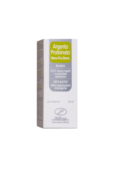 Argento Proteinato New.Fa.Dem. Bambini 0,5% Gocce Nasali e Auricolari, Soluzione 100 g di soluzione contengono: Principio attivo: argento proteinato g 0,5 Argento Proteinato New.Fa.Dem. Adulti 1% Gocce Nasali e Auricolari, Soluzione 100 g di soluzione contengono: Principio attivo: argento proteinato g 1 Argento Proteinato New.Fa.Dem. Adulti 2% Gocce Nasali e Auricolari, Soluzione 100 g di soluzione contengono: Principio attivo: argento proteinato g 2 Per l’elenco completo degli eccipienti vedere paragrafo 6.1