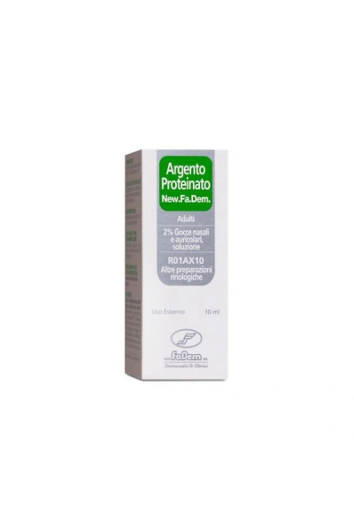 Argento Proteinato New.Fa.Dem. Bambini 0,5% Gocce Nasali e Auricolari, Soluzione 100 g di soluzione contengono: Principio attivo: argento proteinato g 0,5 Argento Proteinato New.Fa.Dem. Adulti 1% Gocce Nasali e Auricolari, Soluzione 100 g di soluzione contengono: Principio attivo: argento proteinato g 1 Argento Proteinato New.Fa.Dem. Adulti 2% Gocce Nasali e Auricolari, Soluzione 100 g di soluzione contengono: Principio attivo: argento proteinato g 2 Per l’elenco completo degli eccipienti vedere paragrafo 6.1