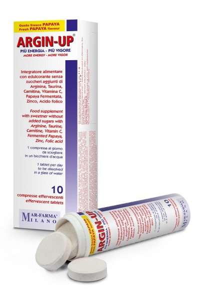 Integratore alimentare con arginina, taurina, carnitina, acido ascorbico, papaia fermentata, zinco e acido folico.