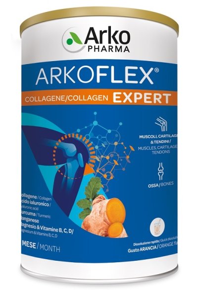 Integratore alimentare in polvere a base di collagene idrolizzato tipo II nativo, acido ialuronico, magnesio, manganese, curcuma e vitamine C, B1, B2, B6, B12 e D. Con edulcoranti.