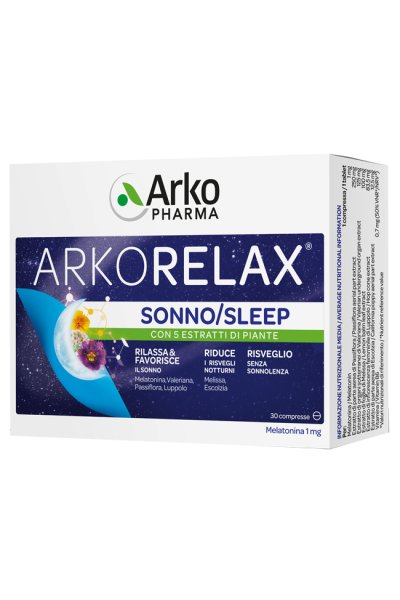 Arkorelax sonno aiuta a ritrovare naturalmente un sonno riparatore. Grazie alla loro azione calmante, gli estratti di passiflora ed escolzia aiutano a rilassare e ad affrontare lo stress quotidiano. Il luppolo e la valeriana con le loro azioni rilassanti, favoriscono il sonno e ne migliorano la qualità. Calmante e rilassante, la melissa è conosciuta per i suoi effetti benefici sulla qualità del sonno. La vitamina B6 contribuisce al buon funzionamento del sistema nervoso e aiuta a ridurre la fatica. Arkorelax sonno associa questi cinque estratti vegetali alla melatonina che contribuisce a ridurre il tempo necessario per addormentarsi.