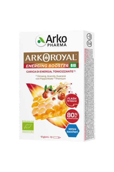 Acqua; edulcorante: eritriolo BIO; pappa reale BIO, estratto di radice di ginseng BIO (Panax ginseng C. A. Meyer), succo concentrato d’arancia BIO [Citrus sinensis (L.) Osbeck], succo concentrato di bacca d’acerola BIO (Malpighia glabra L.), estratto di semi di guaranà BIO (Paullinia cupana Kunth.).
