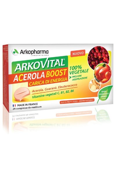 Arkovital Acerola Boost dona una carica di energia, sia fisica che mentale, grazie alla sua formula 100% di origine vegetale a base di guaranà ed eleuterococco, pianta adattogena.