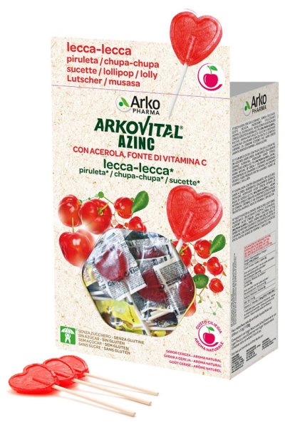 Lecca lecca con edulcoranti, senza zuccheri. Fonte di vitamina C.