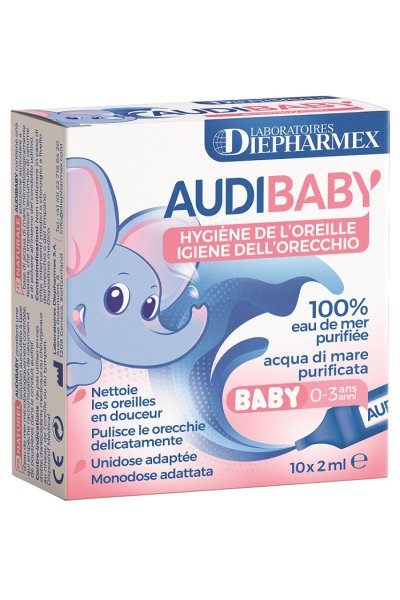 Audibaby contiene una soluzione di acqua marina ipertonica e microbiologicamente testata. Il suo contenuto di ioni e microelementi rende questa soluzione efficace per detergere delicatamente le orecchie dei neonati e dei bambini. Mantiene pulite le orecchie di neonati e bambini e libera il condotto uditivo dalle impurità (cerume, desquamazione, capelli, etc.), agevolandone la naturale fuoriuscita verso l'esterno. Facilita l'esame dei timpani da parte del medico. Un orecchio pulito favorisce un udito ottimale. Utilizzato regolarmente, previene l'accumulo di cerume.