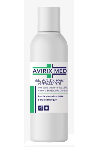 Avirix Med è un gel cosmetico per le mani che pulisce, igienizza e aiuta a preservare lo stato di pulizia delle mani ove non è possibile lavarle mediante le convenzionali prassi di detersione. Con sodio ipoclorito 0,115%, alcool e benzalconio cloruro (preservante). Lascia le mani asciutte. Senza risciacquo.