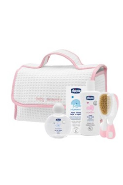 Un beauty case in cotone piquet con maniglia e tasche interne. Racchiude il necessario il bambino durante e dopo il bagnetto. Contiene: acqua di colonia 100 ml (profumo di bambino). Bagno delicato corpo e capelli. Crema corpo. Spazzola e pettine rosa.