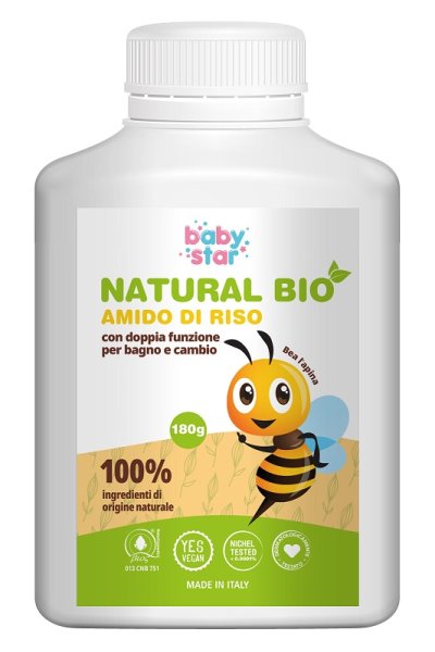 Amido di riso in polvere con doppia funzione: per il bagnetto e per il cambio pannolino.
