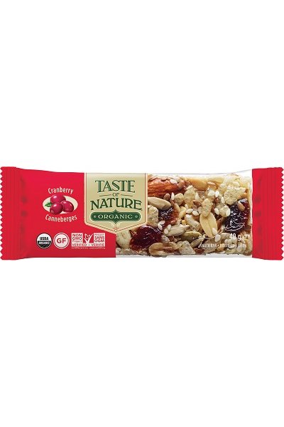 Arachidi, uvetta, sciroppo d'agave, semi di sesamo, mandorle, mirtilli rossi (cranberries) (8%) [mirtilli rossi* (cranberries), succo concentrato di mela, olio di girasole], semi di zucca, sciroppo di riso, estruso di riso integrale, aroma naturale di cranberry.