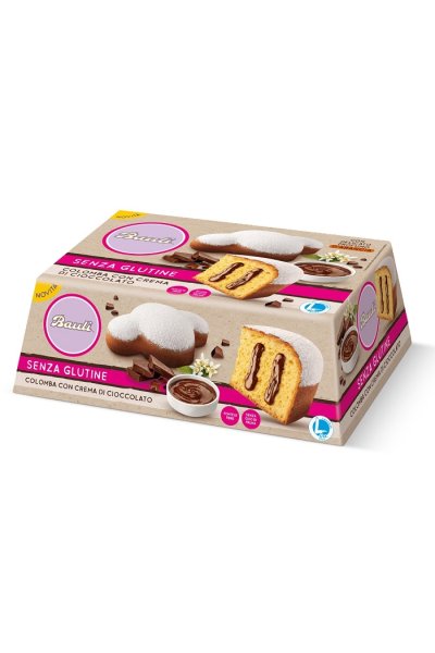 Colomba senza glassa, senza mandorle, senza granella di zucchero, senza canditi, con crema di cioccolato (20%) e pasta di scorze di arance candite (2%).