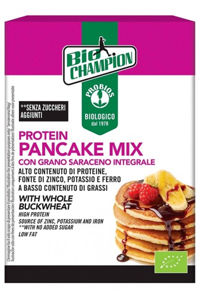 Preparato per pancake ad alto contenuto di proteine e fonte di fibre, a base di farina di fave e grano saraceno integrale. Perfetto per aumentare la quota proteica della colazione, ideale per gli amanti di uno stile di vita dinamico. Fonte di zinco, potassio e ferro, è senza zuccheri aggiunti e senza glutine , perfetto anche per chi segue un'alimentazione vegan. Ingredienti