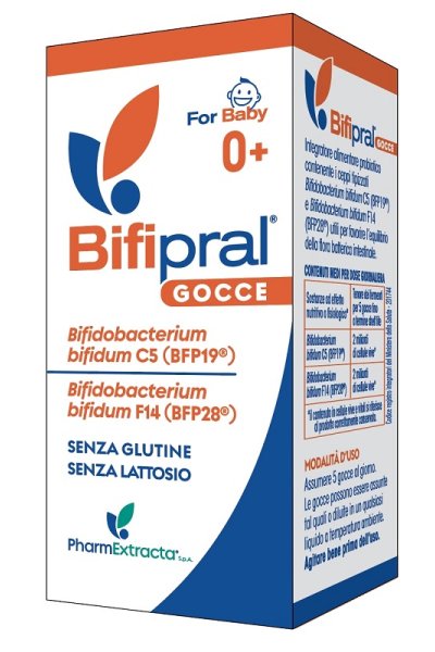 Integratore alimentare probiotico contenente i ceppi tipizzati Bifidobacterium bifidum C5 (BFP19) e Bifidobacterium bifidum F14 (BFP28) utili per favorire l'equilibrio della flora batterica intestinale.