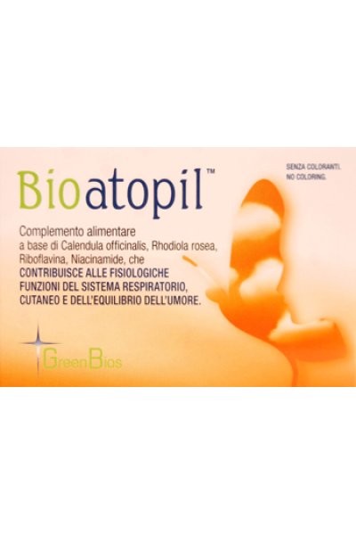 Integratore alimentare a base di Calendula officinalis, Rhodiola rosea, riboflavina, nicotinamide, in grado di contrastare alcuni meccanismi biochimici che sono alla base di malattie reattive come prurito, allergie, affezioni cutanee e respiratorie. L'attività antiossidante potente della Rhodiola rosea e antinfiammatoria della Calendula stabilizzano ulteriormente la produzione dei mediatori biochimici, contrastando i radicali liberi che danneggiano le cellule e i recettori tissutali degli apparati interessati dalla flogosi. L'assunzione di Bioatopil permette di mantenere i livelli ottimali di nutrienti necessari per il funzionamento fisiologico di questi complessi sistemi biochimici. Senza conservanti.