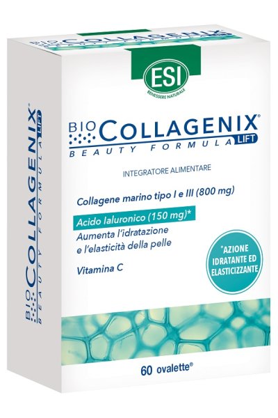 Integratore alimentare a base di collagene marino idrolizzato di tipo I e III altamente purificato, acido ialuronico, resveratrolo, vitamina C, rame e zinco. Il collagene, insieme all'acido ialuronico, contribuisce a mantenere l'elasticità e la compattezza della pelle. Biocollagenix è indicato per tutte le persone che vogliono prendersi cura della propria pelle e degli annessi cutanei (capelli e unghie), con un'azione di stimolo proveniente dall'interno dell'organismo. Ideale in caso di eccessiva esposizione al sole, per le persone che lavorano al chiuso e in locali climatizzati che disidratano la pelle e per le persone che non seguono una dieta corretta.