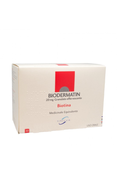 Biodermatin 5 mg Compresse Ogni compressa contiene: Principio attivo Biotina 5 mg Biodermatin 20 mg Granulato effervescente Ogni bustina di granulato effervescente contiene: Principio attivo Biotina 20 mg