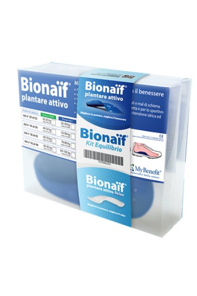 Bionaif Kit Equilibrio è indicato per chi soffre di problemi posturali, mal di schiena, patologie delle ginocchia e dei piedi. Ogni Kit Equilibrio contiene 1 paio di Bionaif Plantare Attivo e 1 paio di Bionaif Plantare Attivo Relax della misura corrispondente.