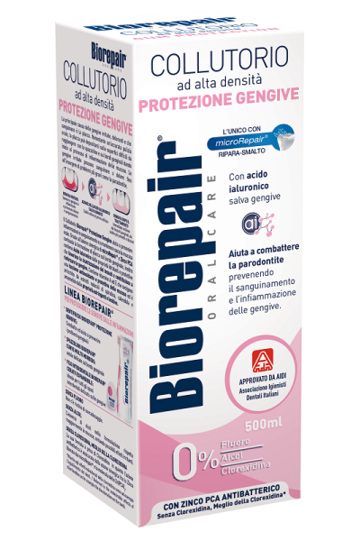Spesso le gengive si infiammano e provocano dolore e sanguinamento: il collutorio Biorepair protezione gengive grazie alla sua formula arricchita con acido ialuronico salva gengive, dona sollievo ai tessuti gengivali già dal primo utilizzo, proteggendoli e idratandoli. Inoltre le proprietà idratanti e protettive dell'acido ialuronico favoriscono la cicatrizzazione dei tessuti gengivali. I microRepair e lo zinco PCA, grazie alla loro azione sinergica, contrastano la formazione di placca sul bordo gengivale. Le vitamine A ed E svolgono una funzione antiossidante e protettiva delle mucose; gli estratti naturali di spirulina, calendula e amamelide hanno proprietà astringenti lenitive.