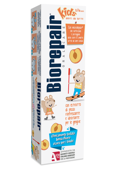 Dentifricio Biorepair Kids, protegge dalla carie ed è ideale per l'igiene orale fin dal primo dentino. Lo smalto dei denti dei bambini è più sottile e vulnerabile di quello degli adulti. Remineralizzarlo è importante per difenderlo dagli attacchi degli acidi degli zuccheri. Biorepair Kids è l'unico che contiene microRepair che rafforzano lo smalto dei denti decidui favorendo un sano e corretto sviluppo dei denti permanenti. La sua efficacia è clinicamente testata. La formula è delicata, dal gusto fruttato e contiene l'estratto di pesca dalle proprietà rinfrescanti e nutrienti per le gengive.