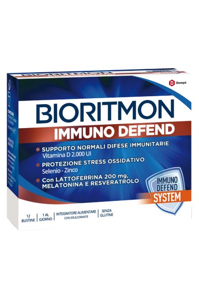 Il sistema immunitario ha lo scopo di difendere l'organismo dagli agenti aggressivi esterni. Bioritmon Immuno Defend, con Immuno Defend System, è un integratore alimentare a base di lattoferrina, resveratrolo, melatonina, vitamina D, selenio, zinco con edulcorante appositamente formulato per sostenere il sistema immunitario e aiutare a contrastare lo stress ossidativo. La vitamina D contribuisce a supportare il corretto funzionamento del sistema immunitario. Lo zinco e il selenio sono minerali essenziali per l'organismo. Fra le loro numerose funzioni ci sono anche quelle di contribuire alla normale funzione del sistema immunitario e di contribuire alla protezione delle cellule dallo stress ossidativo. La melatonina è una sostanza prodotta naturalmente dall'organismo e svolge un ruolo importante nella regolazione dei ritmi circadiani, tra cui il ritmo sonno-veglia. La lattoferrina è una proteina appartenente al gruppo delle glicoproteine coinvolta in varie funzioni; i mammiferi la assumono alla nascita attraverso il colostro e il latte materno ed è fisiologicamente presente in tutti i fluidi organici. Il resveratrolo è una sostanza vegetale antiossidante particolarmente abbondante nell'uva, nel gelso ed in alcune bacche.