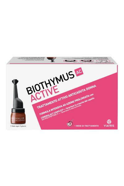 Trattamento coadiuvante specifico per la donna con capelli fragili che tendono a diradarsi, studiato per contrastare la fase iniziale e più intensa della caduta temporanea dei capelli (telogen effluvium). La formula di Biothymus Ac Active fiale unisce ingredienti specifici per il ciclo vitale del capello a mediatori di assorbimento che ne prolungano l’attività.Modalità d'uso